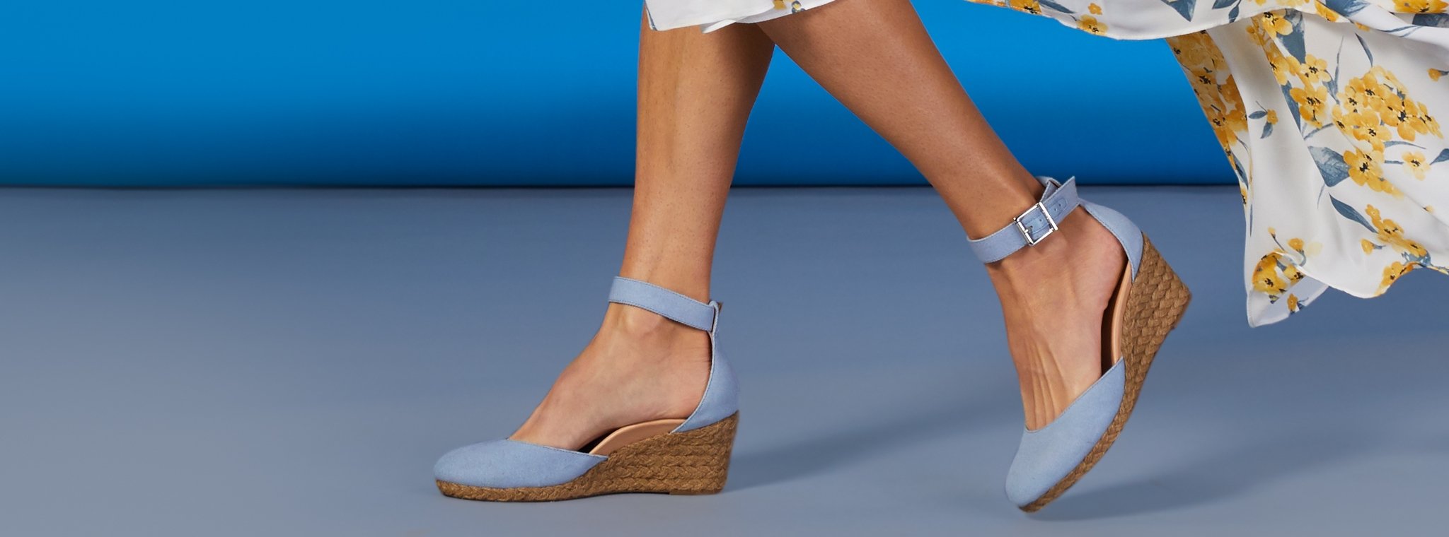 Wedge-heeled espadrilles in cotton canvas with a braided jute trim around the soles. Adjustable ankle strap with a metal buckle. Fabric linings and imitation leather insoles. Heel 9 cm.